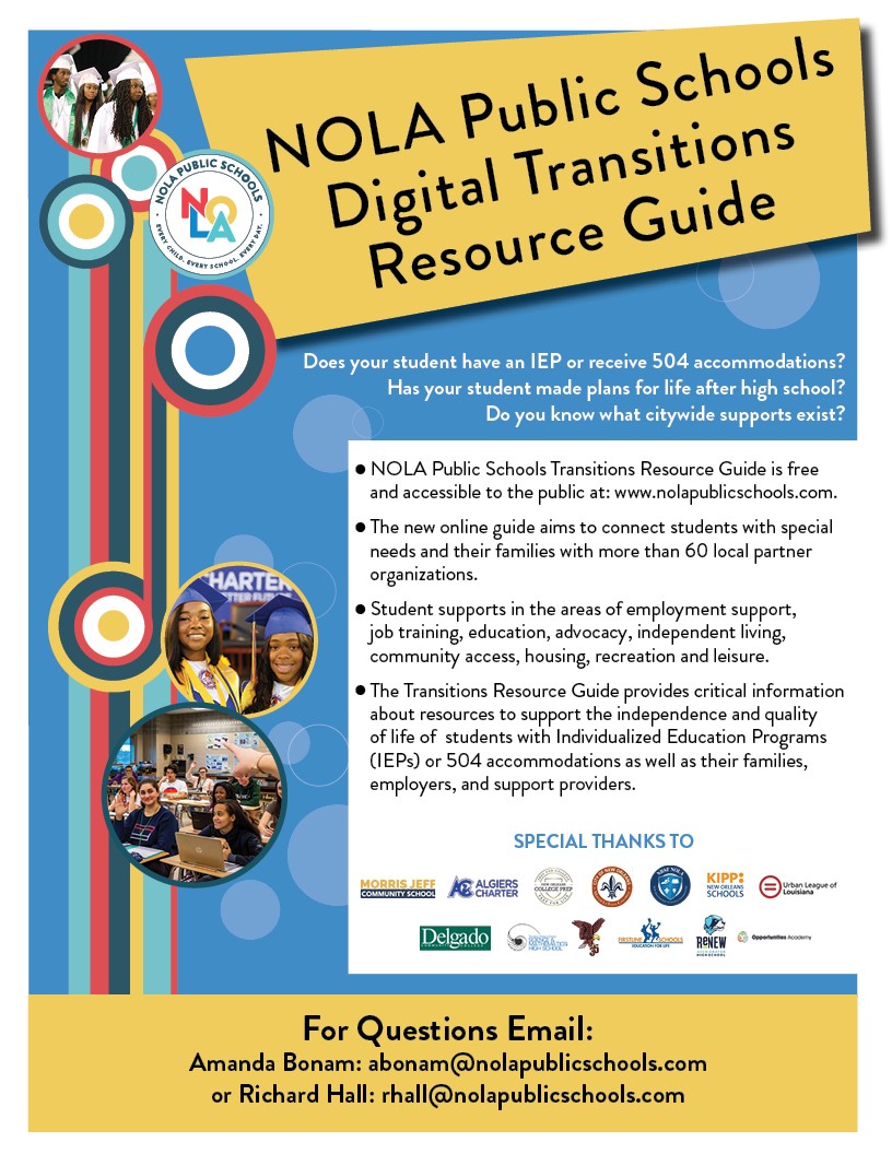 NOLA Public Schools, in collaboration with community partners, recently launched a web-based resource guide designed to assist students with disabilities transitioning into life after their high school careers. The resource guide is a virtual substitute for NOLA-PS’ third annual NOLA-PS Transition Resource Fair, which had to be canceled this year due to the COVID-19 public health crisis